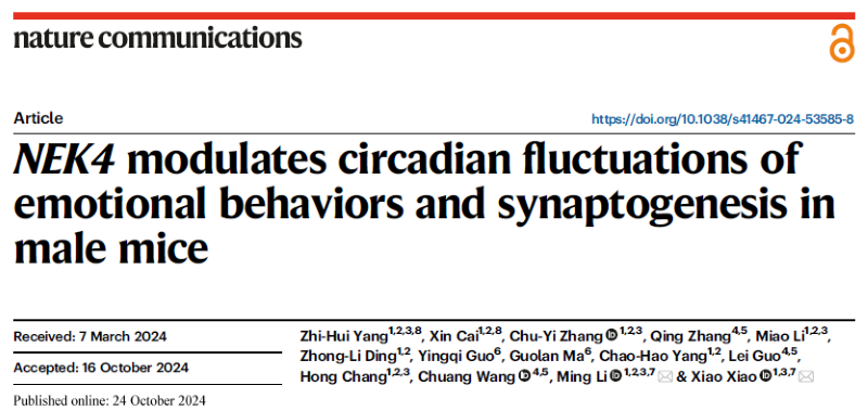 中国科学院昆明动物研究所肖潇团队基于双相障碍患者的GWAS数据及脑组织转录组数据分析,发现海马区NEK4表达上升可能是疾病发生的重要风险因素。研究团队分别通过腺相关病毒介导的海马过表达以及H11-LSL-NEK4; CaMKIIα-Cre条件性过表达手段,在小鼠中验证了NEK4高表达可引发情绪行为的昼夜波动