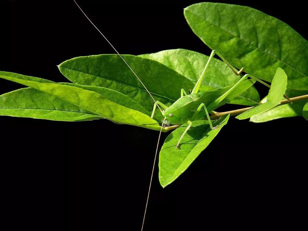 这只螽斯的外形特别像一片树叶吧,它不但拥有与树叶相似的颜色,还有与叶脉类似的图案,而且从轮廓上也非常接近树叶,算是伪装高手了。