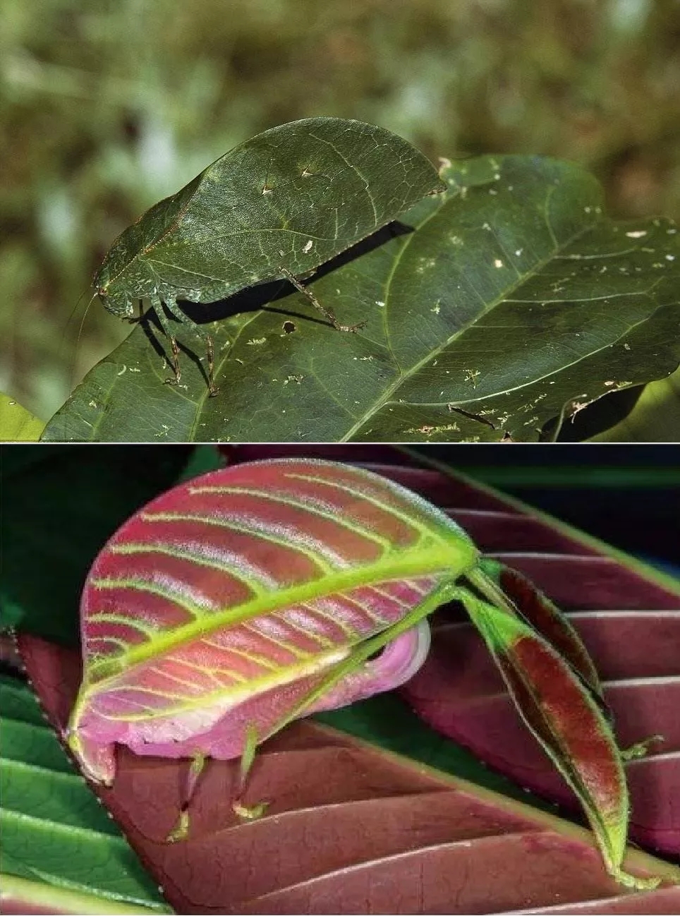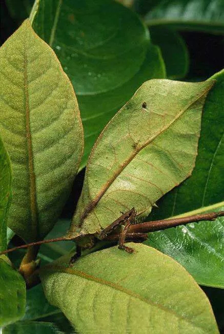 这两只就更厉害了,上面那些螽斯拥有的它都有,此外,自然界中的树叶没有十全十美的,总有一些被虫子咬的洞、腐烂干枯以及沾上脏东西等,所以太完美的树叶在自然界中是比较显眼的,要想不被发现,还是要模仿不完美的树叶。这两只拥有叶子的颜色、图案和形状以外,还模仿了树叶干枯、被虫子咬伤及沾上了一些鸟粪等等,简直就像一片真的树叶,它们可以称得上是伪装大师了。