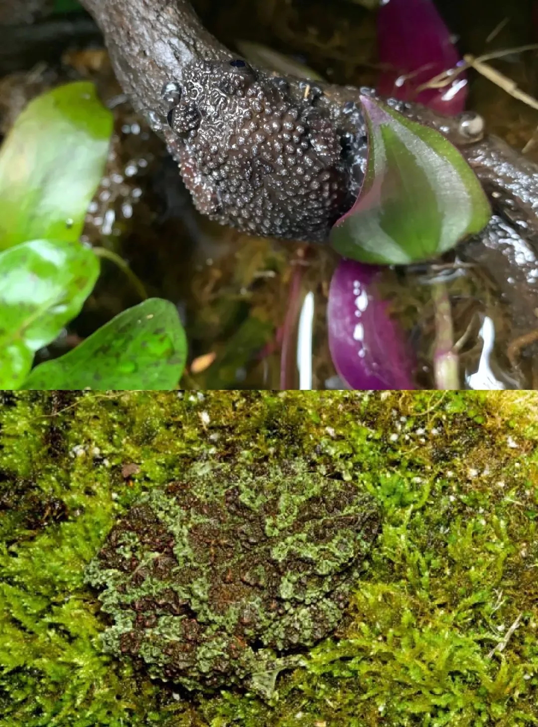 比如上图的两只棱皮树蛙,它们凸凹不平的身体表面和树枝及苔藓十分相似,那是不是更难被发现了呢,不但看起来和周围环境很像而且摸起来也像,所以棱皮树蛙在遇到危险时它们会将身体尽量贴在树干等表面,收起四肢,紧闭双眼,哪怕触碰它,它一般也是一动不动,这样天敌可能真的以为这就是一块树皮或者苔藓。