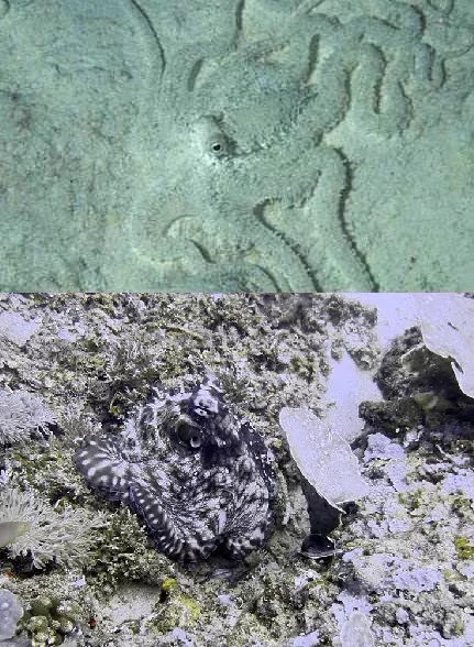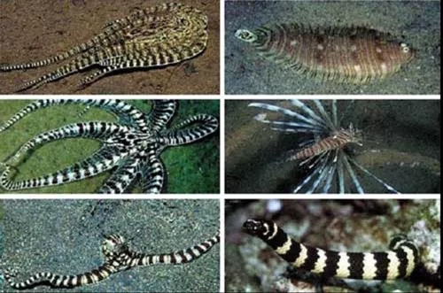 看上图这种拟态章鱼,模拟比目鱼、狮子鱼和海蛇等其他动物这都是小伎俩,它模仿起周围环境来那简直就像穿了隐形衣。