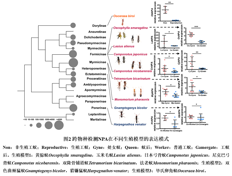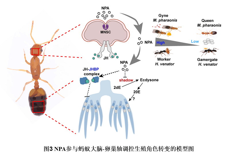 中国科学院昆明动物研究所生物多样性基因组学研究团队长期致力于对社会性昆虫大脑的研究,此前在比较了不同生殖方式蚂蚁的大脑转录组数据后发现Neuroparsin-A(NPA)是最早响应生殖转变的差异表达基因,并且这一基因在非生殖状态的个体中保持着更高的表达状态,猜测NPA处于调控蚂蚁生殖可塑性的重要位置。研究团队以此为基础,检测了NPA在上述几种不同生殖模式的表达差异和在大脑中的表达位置后,发现NPA保守性地表达在蚂蚁大脑的中央神经分泌细胞中,并且表达模式均为非生殖个体高表达。在以法老小家蚁(Monomorium pharaonis)为代表的处女蚁/蚁后的生殖模式中,利用RNA干扰和过表达技术,发现NPA对卵巢中卵子发育的抑制性作用;长期实验显示NPA影响了个体的活动力和觅食行为,推测NPA是维持非生殖行为的重要因子。此外,利用猎镰猛蚁(Harpegnathos venator)探究普通工蚁/工蚁后生殖模式的实验中也证明了NPA对工蚁卵子发育的抑制作用,以及对捕食行为的影响。