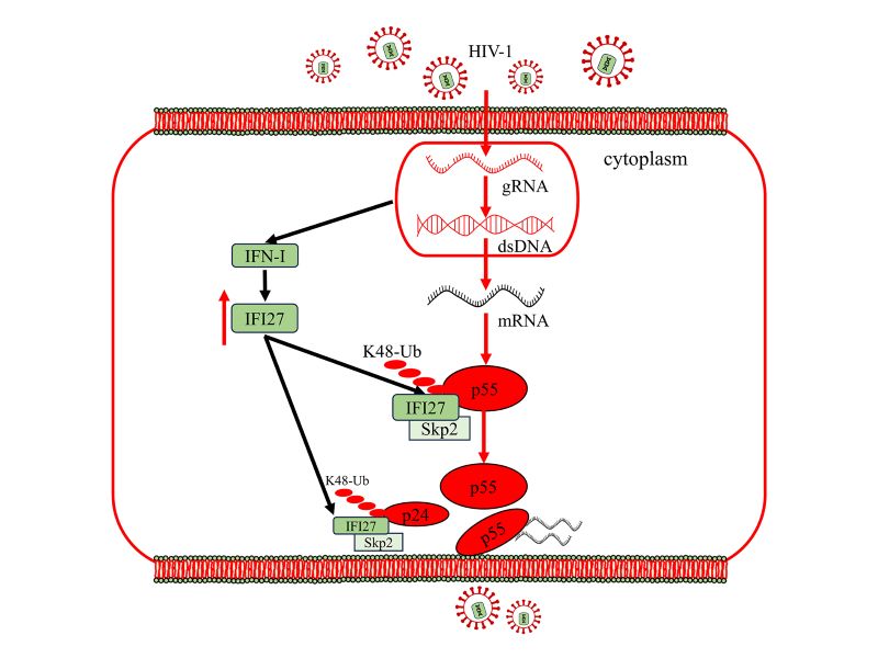 图1. IFI27抑制HIV-1复制的分子作用机制