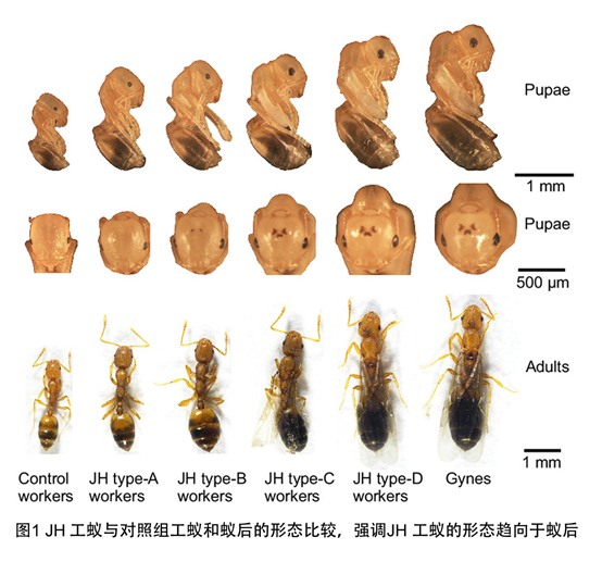 保幼激素(Juvenile hormone, JH)是昆虫发育中最重要的激素之一,其主要功能为保持幼虫状态和抑制早熟。在超有机体中,JH在幼虫发育阶段展现出更加多样化且复杂的功能。早前很多实验观察表明,JH的剂量及其作用时间窗口对决定蚁后和工蚁的命运以及工蚁内部不同亚品级的命运至关重要。然而,对于JH处理怎样打破品级分化过程中的渠化现象,各个器官对JH处理的响应有何不同,以及这一过程中涉及到的分子调控机制发生了怎样的重塑等问题,目前人们仍然知之甚少。