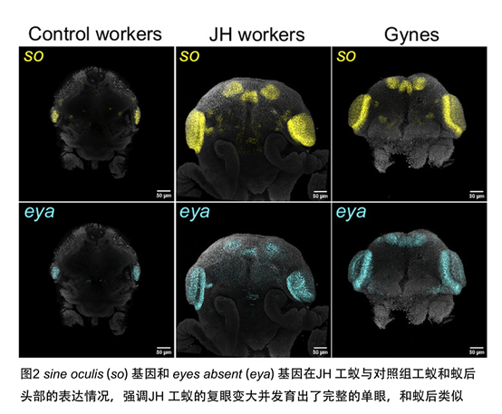 中国科学院昆明动物研究所生物多样性基因组学研究团队长期致力于对蚂蚁蚁后和工蚁品级分化的研究。此前以法老蚁(Monomorium pharaonis)为模式物种,发现生殖细胞在工蚁末龄胚胎和一龄幼虫中已经彻底消失,说明该物种蚁后和工蚁的品级分化的启动时间提前至了胚胎或卵子形成期,并且通过全发育期的单个体转录组测序,说明该物种的品级分化是一个渠化式发育过程。研究团队以此为基础,通过对三龄工蚁幼虫持续饲喂JH类似物(以下简称为JH工蚁),发现由成虫盘发育而来的器官,包括翅、单眼、复眼、触角柄节、交配囊、储精囊和输卵管等,都能像蚁后一样完整发育(图1)。通过荧光原位杂交技术,确定了多个器官特异标记基因:复眼和单眼基因sine oculis和eyes absent,以及翅的标记基因vestigial和engrailed,也响应于JH诱导,在JH工蚁中特异高表达(图2)。此外,研究团队通过苏木精-伊红染色、脂滴染色和大脑三维重构,确定了JH工蚁在飞行肌、脂肪体和大脑(包括蘑菇体、触角叶、视叶和中央复合体等脑区)等器官上表现出更大的体积,使这些器官的发育特征更接近蚁后。然而,JH的诱导却始终不能对卵巢起作用,与对照组工蚁一样,JH工蚁中始终没有发育出卵巢,说明工蚁卵巢的发育不受三龄幼虫期间JH类似物处理的影响,也进一步提示蚂蚁不同品级生殖细胞系和体细胞系分化的时间窗口是不对称的,在发育过程中具有异时性。研究团队进一步以vasa和headcase作为标记基因,通过幼虫整体的荧光原位杂交技术,确认了构成卵巢的生殖细胞和体细胞都在工蚁三龄幼虫中完全消失,证实了JH工蚁无法发育出卵巢。行为学分析显示,JH工蚁羽化为成虫后,虽然其外在形态已经十分接近蚁后,然后,其活动力介于工蚁和蚁后之间,不能完全复现蚁后的行为模式,这提示其行为受大脑发育和卵巢缺失的共同影响。