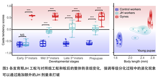 为了阐明JH处理逆转蚂蚁不同品级渠化发育的分子机制,研究团队对三龄幼虫期、预蛹期和蛹期的单个体进行了转录组测序,并且对JH工蚁、对照组工蚁和蚁后之间的基因表达差异进行量化,发现随着发育的进行,JH工蚁与蚁后的差距减小并且与对照组工蚁的差距增大(图3)。这个结果表明JH类似物处理可以打破品级分化过程中的渠化现象,并且把工蚁的发育轨迹逆转成蚁后,这与JH工蚁除了卵巢之外其余各器官的发育都与蚁后类似的表型相吻合。研究团队进一步筛选出了95个响应于JH且表达模式呈现出高度渠化现象的核心基因,为深入探索JH介导的渠化式品级分化机制提供了候选靶标。