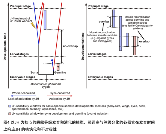 基于以上研究结果,并且在经典的二分发育模型的基础上,团队提出了一个以JH为核心的蚂蚁品级发育和演化的模型。该模型指出,在蚂蚁向超有机体不可逆的演化过程中,不同器官逐渐演化出了新的分子机制来直接响应JH的调控,即JH信号通路下调和上调促使各器官分别向工蚁和蚁后方向渠化式发育。各器官响应JH的时间段存在发育异时性,例如在法老蚁中,卵巢可能在胚胎期响应JH,而其它由体细胞组成的器官则主要在三龄幼虫期响应JH,这体现了JH对于各器官的模块化调控。团队进一步提出,如果各器官响应JH的时间段在发育上有部分重叠,那么自然情况下JH在时间和空间上的扰动可能会导致嵌合了蚁后和工蚁的中间品级个体的产生,即一部分器官沿着蚁后方向发育,另一部分器官则沿着工蚁方向发育(图4)。根据蚁群超有机体适应环境的需要,这些中间品级个体在偶然情况下可以通过作用在整个蚁群层面的自然选择作用而得以固定下来,并且进一步演化成拟工蚁和兵蚁等新型蚂蚁品级,从而优化整个蚁群的生存与繁殖能力。这一过程可能是解释为什么多个蚂蚁类群中会出现亚品级多态性的一个重要因素。