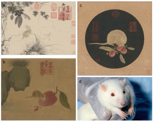 a《苦瓜鼠图》,b《菖蒲鼠荔图》,c《食荔图》,d 现代维斯塔(Wistar)大鼠