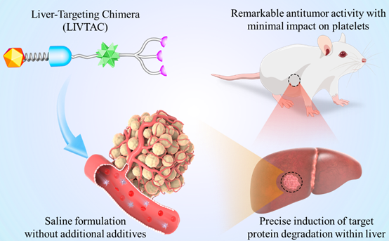 前期,中国科学院昆明动物研究所何永捍团队联合上海药物研究所张翾团队,利用肝脏特异高表达的去唾液酸糖蛋白受体(Asialoglycoprotein receptor,?ASGPR),将PROTAC分子与ASGPR配体偶联,成功开发出肝脏靶向的蛋白降解剂(Liver-targeting chimera, LIVTAC)(图1)。LIVTAC主要在肝脏被摄取和释放,可精准降解肝内靶蛋白,特异杀伤肝癌细胞,从而有效地抑制肝癌的进展,显著提高生存率(Chen et al. Journal of Controlled Release. 2024)。