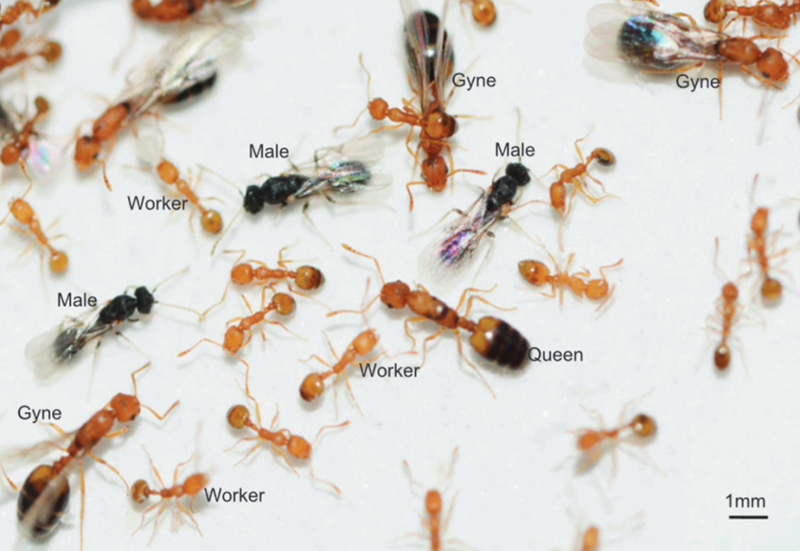 社会性昆虫严格的社会分工为研究多巴胺系统在行为调控中的功能提供了理想模型。在蚂蚁中,工蚁(worker)作为"终身劳动者",负责巢穴维护、育幼和觅食等全部日常工作;处女繁殖蚁(gyne)短暂地存在于巢穴中,在完成一生一次的交配后转变为蚁后;蚁后(queen)在巢穴中“深居简出”专注产卵;雄蚁(male)则如同"飞行精子库",在完成交配使命后不久死亡(图1)。这种极端的等级分化现象背后,究竟隐藏着怎样的多巴胺调控机制?不同等级个体的多巴胺神经元是否存在本质差异?这些差异又如何决定其截然不同的行为模式和生理特征?解答这些问题,不仅有助于揭示社会性昆虫的演化奥秘,更能为理解神经递质调控社会行为的普遍规律提供新的视角。
