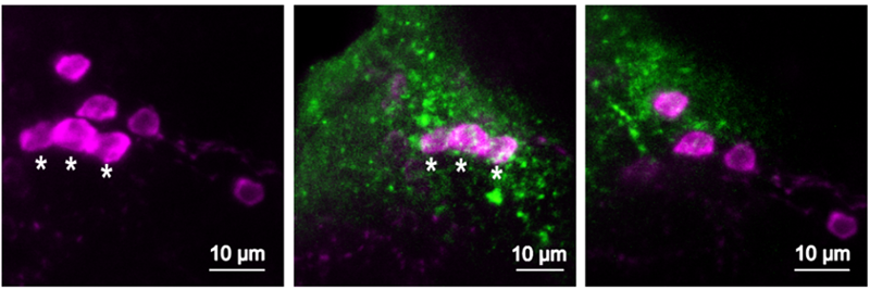 图2?PPL2b(星号)神经元靠近Nlg2(green)的表达区域