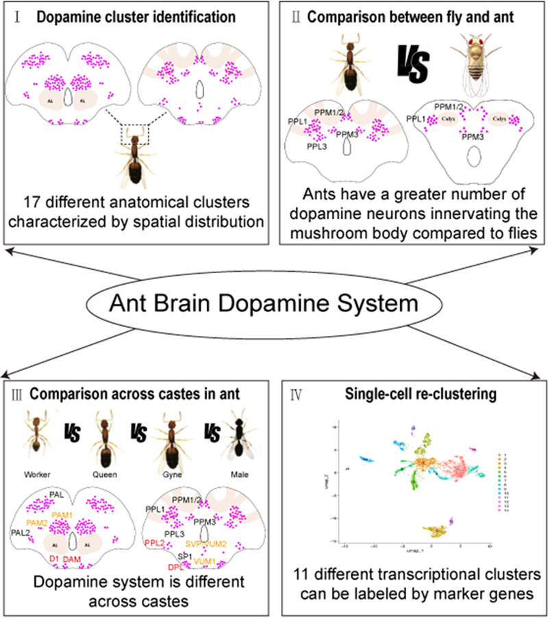 本研究系统地描述和比较了蚂蚁大脑中的多巴胺能神经元,并提供了进一步区分多巴胺能神经元异质性的分子标记。该研究结果为进一步研究蚂蚁劳动分工和等级特异性行为的神经机制奠定了基础。