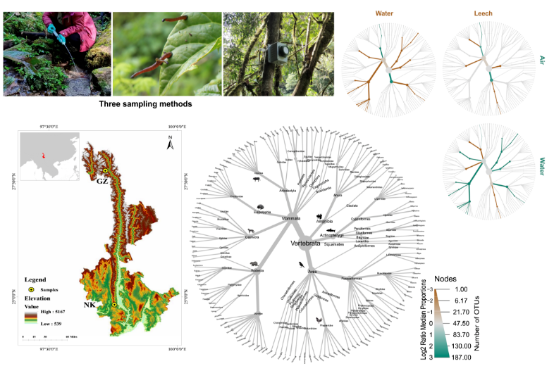 近日,该中心在高黎贡山地区开展的一项突破性研究,系统比较了三种环境DNA(environmental DNA,eDNA)采样策略的脊椎动物物种检测效率:水体eDNA、空气eDNA和来自水蛭的无脊椎动物衍生DNA(invertebrate-derived DNA,iDNA)。该研究采用五套引物组合进行Metabarcoding分析,成功检测到235个脊椎动物物种。研究结果显示,水体eDNA表现最佳,检测到173个物种(含100个独有物种),尤其擅长识别小型动物;水蛭iDNA次之,检出102个物种(含37个独有物种),对地面活动动物监测优势显著;空气eDNA检出56个物种(含20个独有物种),在小型鸟类监测中表现突出。研究通过多物种占域模型验证了eDNA技术的可靠性,并成功复原了脊椎动物类群的分布模式。