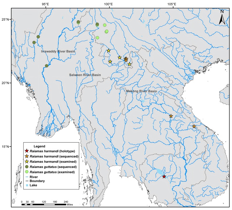 长嘴鱲属(Raiamas)是?科中体型最大的鱼类之一,以极长的口裂著称,在亚洲仅有少数物种分布。早在1880年,法国学者Sauvage基于柬埔寨洞里萨湖标本描述了哈氏长嘴鱲(R. harmandi,?原始描述为Bola harmandi),1964年我国学者又在西双版纳采集到7尾标本并命名为大口鱼(Luciosoma fasciata)。但随后,这两个物种均被修订为长嘴鱲(R. guttatus)的同物异名,逐渐被遗忘。
