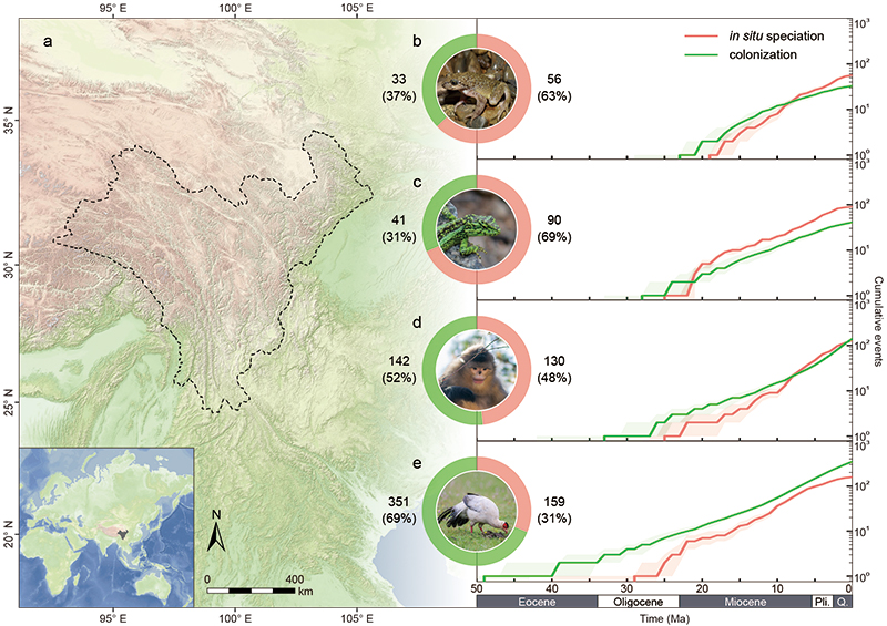 横断山区是全球?36?个生物多样性热点地区之一,仅占我国陆地面积的5%,却孕育了超过30%的维管植物和陆生脊椎动物,其中还包含大量的特有物种。该地区地质历史复杂,既经历了剧烈的造山运动,又深受亚洲季风演化的深远影响。前期研究提示,横断山区丰富的植物多样性主要通过本地分化(in situ speciation)积累,且爆发时间与山体快速隆升时期一致(Xing & Ree ,2017);而基于哺乳动物的研究则提示外来拓殖(colonization)是其主要的积累模式(Feijó et al标点符号重复!2022)。这是否意味着一个区域物种多样性的繁盛可以通过多种模式形成?上述的研究差异是否是由于类群本身特性所导致?重大的地质和气候事件能否超越类群特性而引发多样性的同步爆发?
