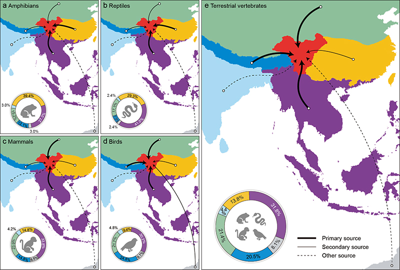 为了回答上述问题,昆明动物研究所车静团队领衔生物多样性中心及国内多个团组,以陆生脊椎动物为研究对象,对横断山区生物多样性的形成演化机制开展了系统性研究。研究最大程度地囊括了两栖类、爬行类、鸟类和兽类,共计4 ,862种陆生脊椎动物,其中851种分布于横断山区,覆盖该地区陆生脊椎动物多样性的73.4%。研究重建了横断山区陆生脊椎动物的时空演化格局,通过跨类群的比较分析发现,各类群表现出与自身特性相关的差异化演化模式:本地分化事件在扩散能力较弱的两栖类和爬行类中占比较高,在兽类中本地分化与外来拓殖事件贡献相当,而在具有较强扩散能力的鸟类中则呈现出外来拓殖事件占主导的模式(图1)。从整个陆生脊椎动物角度,研究支持横断山区既是新物种大量产生的“摇篮(cradle)”,也是周边生物区系的“汇集区(sink)”,其中超过30%的外来拓殖事件源自印马地区(Indo-Malay region)(图2)。尽管不同类群在多样性累积模式上表现出显著差异,但该地区在中新世晚期活跃的造山运动及季风增强却引发了它们在这一时期同步的多样性爆发(图3)。通过多类群整合分析,该研究为理解区域多样性演化机制提供了新的见解,提示以特定类群作为研究对象往往会带来结果的巨大差异,应在研究中注意对不同类群生物特性的分析和考虑。同时,在未来的?;す婊幸灿Τ浞挚悸抢嗳禾匦裕杂行вΧ圆煌嗳旱亩捞匦枨笥胩粽?。