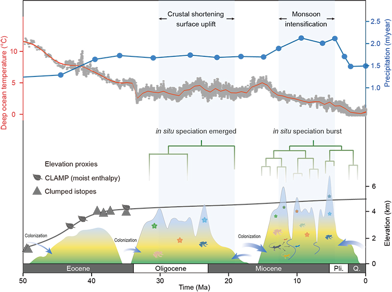 山地系统是全球生物多样性?;さ墓丶?,其生物多样性的形成与演化是受地球板块运动和气候变化的共同影响,最终落脚于物种形成、拓殖和灭绝等事件的综合过程。重建物种演化历史并解析其驱动因素,不仅有助于揭示区域生物多样性形成的基本规律,也将为预测全球气候变化下的生物响应提供重要参考。