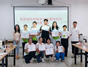 探索之旅在硬核科研氛围中启航。首日,联合生物多样性基因组学研究组,营员们系统地学习蚂蚁分类学与行为生态学核心知识,刘薇薇副研究员深入浅出地解析蚂蚁社会结构、进化历史及属种特征差异;在生物多样性基因组团队的带领下参观实验室,通过透明观察窗见证它们井然有序的觅食行动,并亲手设计搭建了迷你生态蚁巢,书本上“社会性昆虫”的概念瞬间变得鲜活生动,抽象的科研成果转化为触手可及的实践乐趣,点燃了后续探索的热情。之后,陈超博士研究生从在野外认识蚂蚁、在野外采集蚂蚁、在实验室制作、鉴定蚂蚁、攥写科学考察报告几个方面,展开详细讲述,为后续微型课题研究植入严谨方法论。次日,探索升级为城市生境“寻蚁总动员”,深入公园绿地等多样化生态位点,运用前一天所学的专业方法,营员们小心翼翼地搜寻、识别并科学采集蚂蚁样本,毛蚁属,盘腹蚁属,蚁属,大头蚁属,举腹蚁属,粗角蚁属,切叶蚁属……,每一次发现都伴随着惊喜的欢呼和细致的记录,不仅用镜头精准捕捉不同生境的独特风貌,更在陈超博士研究生的指导下,以小组为单位严谨记录蚂蚁活动行为及分布数据,极大地锻炼了他们的观察力、团队协作能力和沟通技巧,他们深刻体会到,即使是在钢筋水泥的城市中,微小蚂蚁的生存策略中蕴含着令人叹服的生态智慧。第三、四日,研学重心转入更为精细严谨的实验室环节,面对自己亲手从野外采集回来的珍贵样本,营员们展现出令人赞叹的耐心与专注,在陈超博士研究生的指导下,首先使用超景深三维显微镜拍摄蚂蚁标本的高清图像,之后使用体视显微镜小心翼翼地清洁样本,去除附着物,再对每一份样本进行规范、清晰的编号标记,然后学习并动手制作专业的蚂蚁标本,依据形态特征进行细致的观察、比对,最后统计蚂蚁种类和采集地的数据。经过前几日的努力,营员们在结营日成功完成了对野外采集蚂蚁样本的最终鉴定工作,并以小组协作进行成果汇报,4个小组以清晰的逻辑,以PPT汇报的形式系统呈现了从发现问题,提出合理的科学问题,到设计并执行严谨的采集与实验方案来收集证据,最终通过分析凝练思考,得出有理有据的结论,这不仅是知识的梳理与汇报,更是形成了严谨的科学思维逻辑(发现问题-提出问题-分析问题-解决问题)、批判性思考能力、团队协作精神以及清晰表达能力的综合展现,他们自信从容的台风、闪烁着智慧光芒的分享,赢得了现场热烈的掌声。